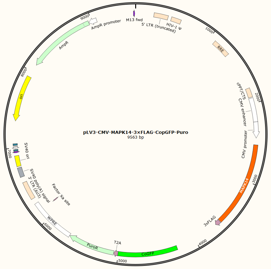 pLV3-CMV-MAPK14-3×FLAG-CopGFP-Puro是以基恩科生物自研慢病毒骨架载体pLV3-CMV-MCS-3×FLAG-CopGFP-Puro为骨架载体构建,过表达小鼠MAPK14基因,与载体PMD2.G和Pspax2配套进行慢病毒包装。