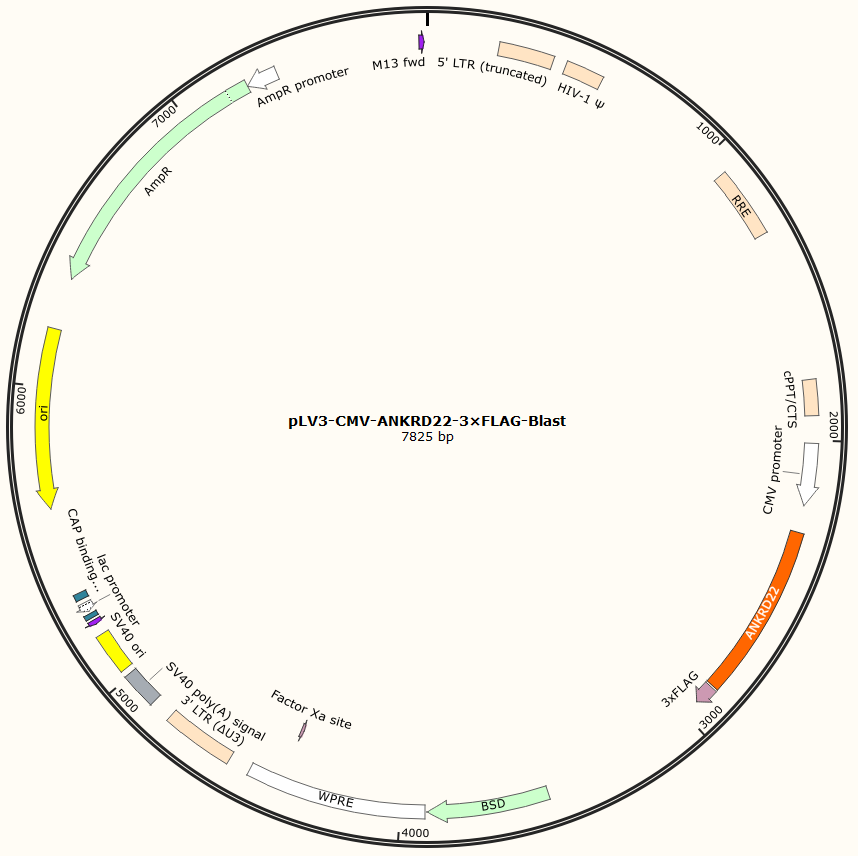 pLV3-CMV-ANKRD22-3×FLAG-Blast是以基恩科生物自研慢病毒骨架载体pLV3-CMV-MCS-3×FLAG-Blast为骨架载体构建,过表达小鼠ANKRD22基因,与载体PMD2.G和Pspax2配套进行慢病毒包装。