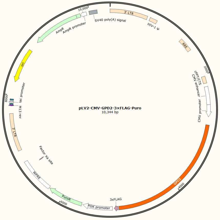 pLV2-CMV-GPD2-3×FLAG-Puro是以基恩科生物自研慢病毒骨架载体pLV2-CMV-MCS-3×FLAG-Puro为骨架载体构建,过表达小鼠GPD2基因,与载体PMD2.G和Pspax2配套进行慢病毒包装。