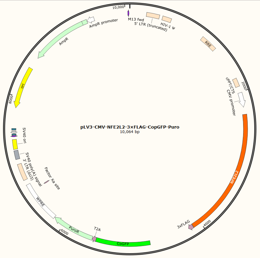 pLV3-CMV-NFE2L2-3×FLAG-CopGFP-Puro是以基恩科生物自研慢病毒骨架载体pLV3-CMV-NFE2L2-3×FLAG-CopGFP-Puro为骨架载体构建,过表达小鼠NFE2L2基因,与载体PMD2.G和Pspax2配套进行慢病毒包装。