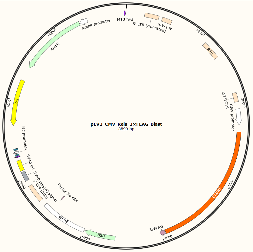 pLV3-CMV-Rela-3×FLAG-Blast是以基恩科生物自研慢病毒骨架载体pLV3-CMV-MCS-3×FLAG-Blast为骨架载体构建,过表达小鼠Rela基因,与载体PMD2.G和Pspax2配套进行慢病毒包装。