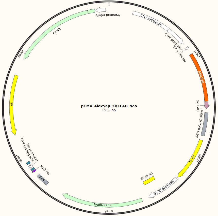 | GC020401042 | pCMV-Alox5ap-3×FLAG-Neo | 2μg | Alox5ap基因过表达 | 800.00 | 2-3天 |