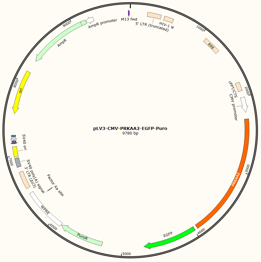 pLV3-CMV-PRKAA2-EGFP-Puro是以基恩科生物自研慢病毒骨架载体pLV3-CMV-MCS-EGFP-Puro为骨架载体构建,过表达小鼠PRKAA2基因,与载体PMD2.G和Pspax2配套进行慢病毒包装。