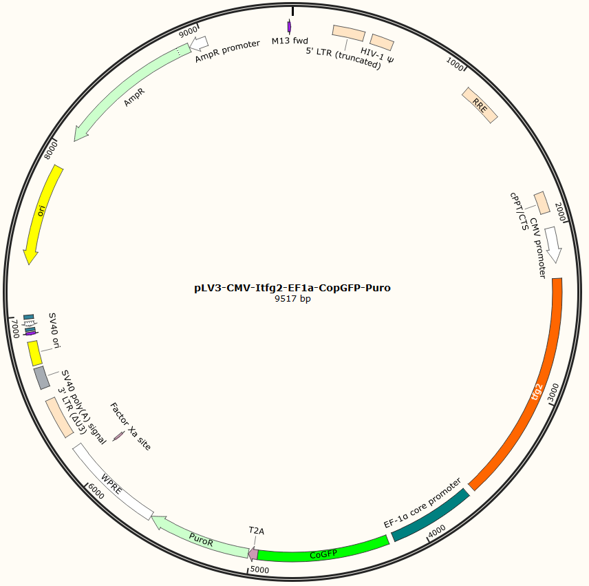 pLV3-CMV-Itfg2-EF1a-CopGFP-Puro是以基恩科生物自研慢病毒骨架载体pCpLV3-CMV-MCS-EF1a-CopGFP-Puro为骨架载体构建,过表达小鼠tfg2基因,与载体PMD2.G和Pspax2配套进行慢病毒包装。