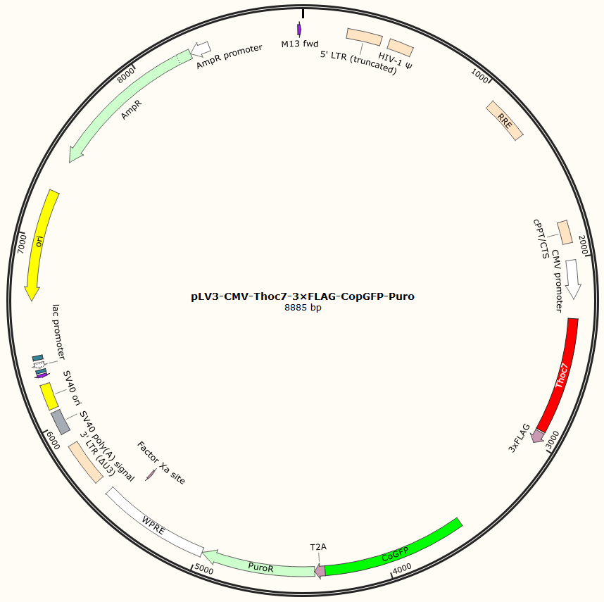 pLV3-CMV-Thoc7-3×FLAG-CopGFP-Puro是以基恩科生物自研慢病毒骨架载体pLV3-CMV-MCS-3×FLAG-CopGFP-Puro为骨架载体构建,过表达小鼠Thoc7基因,与载体PMD2.G和Pspax2配套进行慢病毒包装。