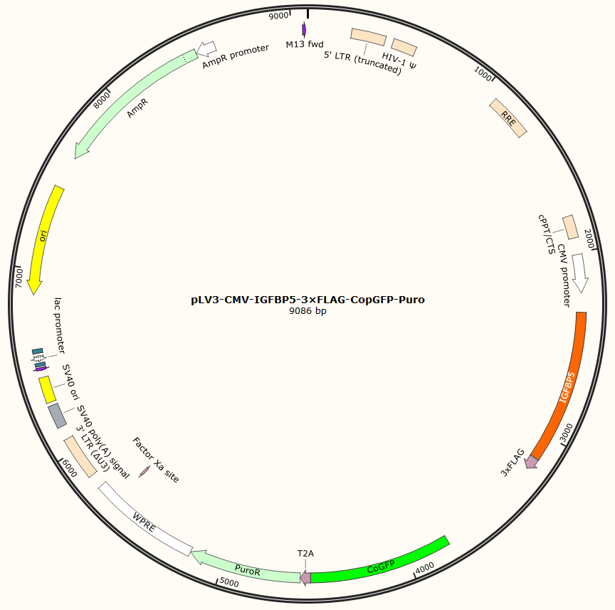 pLV3-CMV-IGFBP5-3×FLAG-CopGFP-Puro是以基恩科生物自研慢病毒骨架载体pLV3-CMV-MCS-3×FLAG-CopGFP-Puro为骨架载体构建,过表达小鼠IGFBP5基因,与载体PMD2.G和Pspax2配套进行慢病毒包装。