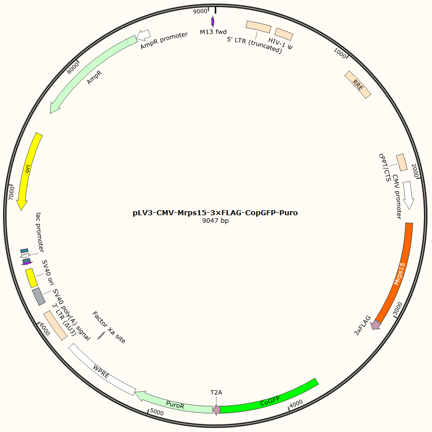 pLV3-CMV-Mrps15-3×FLAG-CopGFP-Puro是以基恩科生物自研慢病毒骨架载体pLV3-CMV-MCS-3×FLAG-CopGFP-Puro为骨架载体构建,过表达小鼠Mrps15基因,与载体PMD2.G和Pspax2配套进行慢病毒包装。
