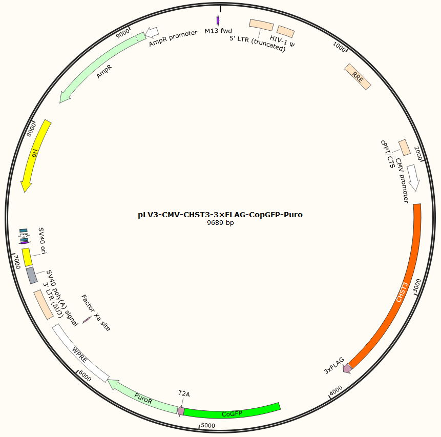 pLV3-CMV-CHST3-3×FLAG-CopGFP-Puro是以基恩科生物自研慢病毒骨架载体pLV3-CMV-MCS-3×FLAG-CopGFP-Puro为骨架载体构建,过表达小鼠CHST3基因,与载体PMD2.G和Pspax2配套进行慢病毒包装。