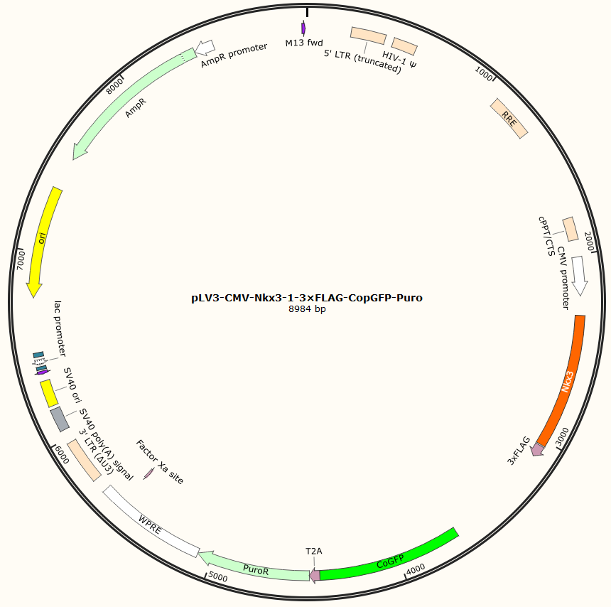 pLV3-CMV-Nkx3-1-3×FLAG-CopGFP-Puro是以基恩科生物自研慢病毒骨架载体pLV3-CMV-MCS-1-3×FLAG-CopGFP-Puro为骨架载体构建,过表达小鼠Nkx3基因,与载体PMD2.G和Pspax2配套进行慢病毒包装。