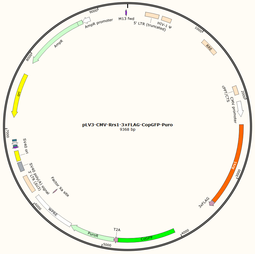 pLV3-CMV-Rrs1-3×FLAG-CopGFP-Puro是以基恩科生物自研慢病毒骨架载体pLV3-CMV-MCS-3×FLAG-CopGFP-Puro为骨架载体构建,过表达小鼠Rrs1基因,与载体PMD2.G和Pspax2配套进行慢病毒包装。