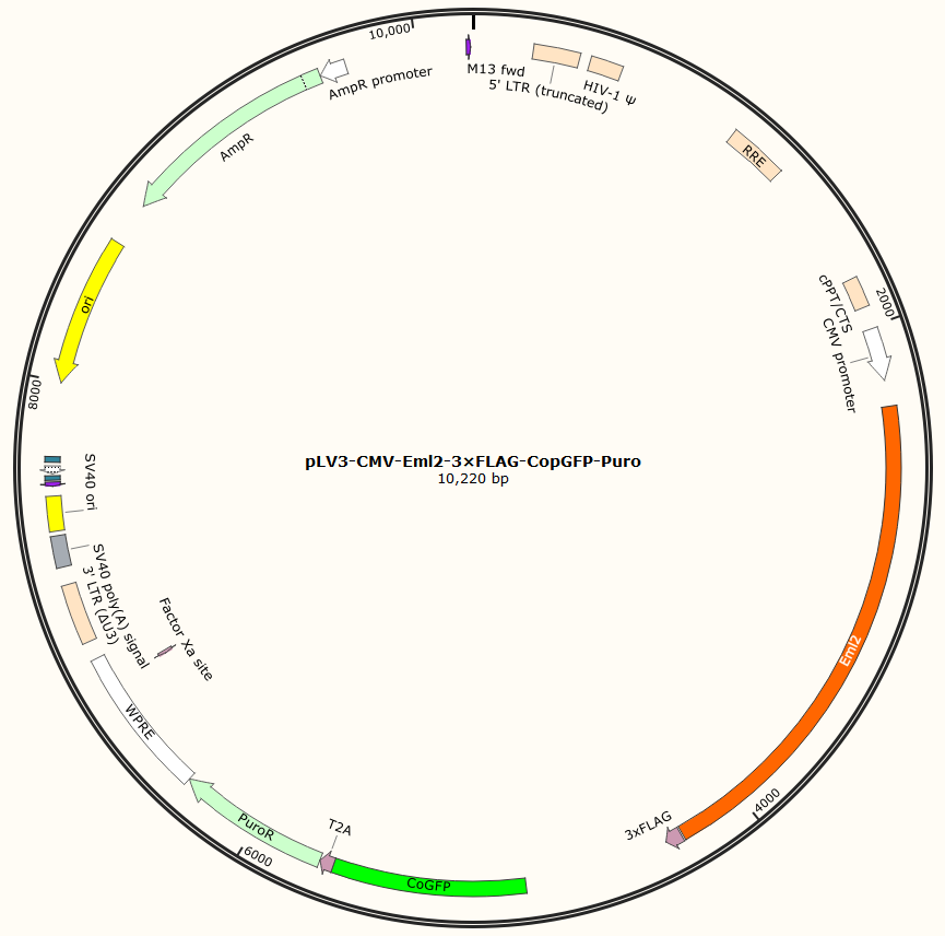 pLV3-CMV-Eml2-3×FLAG-CopGFP-Puro是以基恩科生物自研慢病毒骨架载体pLV3-CMV-MCS-3×FLAG-CopGFP-Puro为骨架载体构建,过表达小鼠Eml2基因,与载体PMD2.G和Pspax2配套进行慢病毒包装。