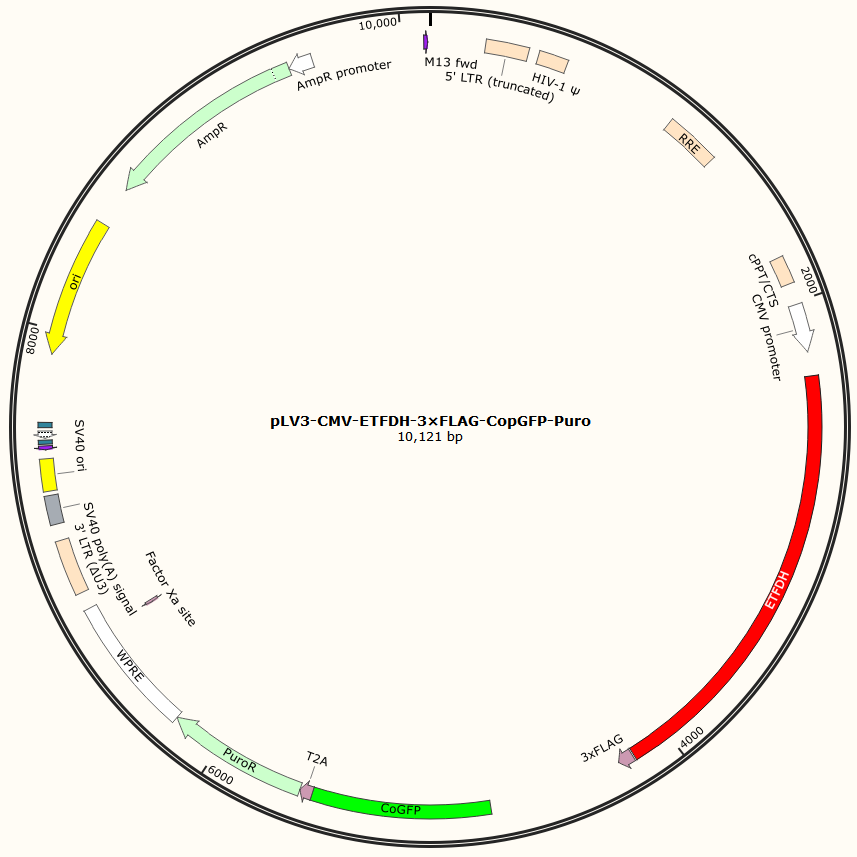 pLV3-CMV-ETFDH-3×FLAG-CopGFP-Puro是以基恩科生物自研慢病毒骨架载体pLV3-CMV-MCS-3×FLAG-CopGFP-Puro为骨架载体构建,过表达小鼠ETFDH基因,与载体PMD2.G和Pspax2配套进行慢病毒包装。