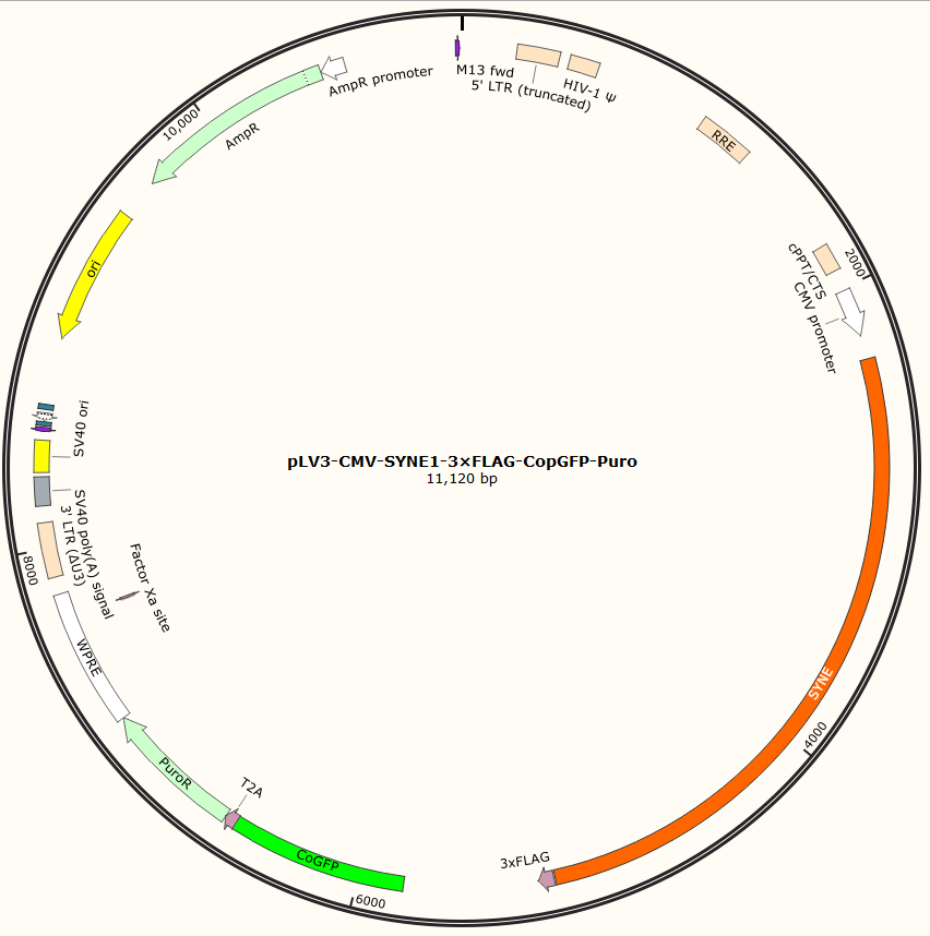 pLV3-CMV-SYNE1-3×FLAG-CopGFP-Puro是以基恩科生物自研慢病毒骨架载体pLV3-CMV-MCS-3×FLAG-CopGFP-Puro为骨架载体构建,过表达小鼠SYNE基因,与载体PMD2.G和Pspax2配套进行慢病毒包装。