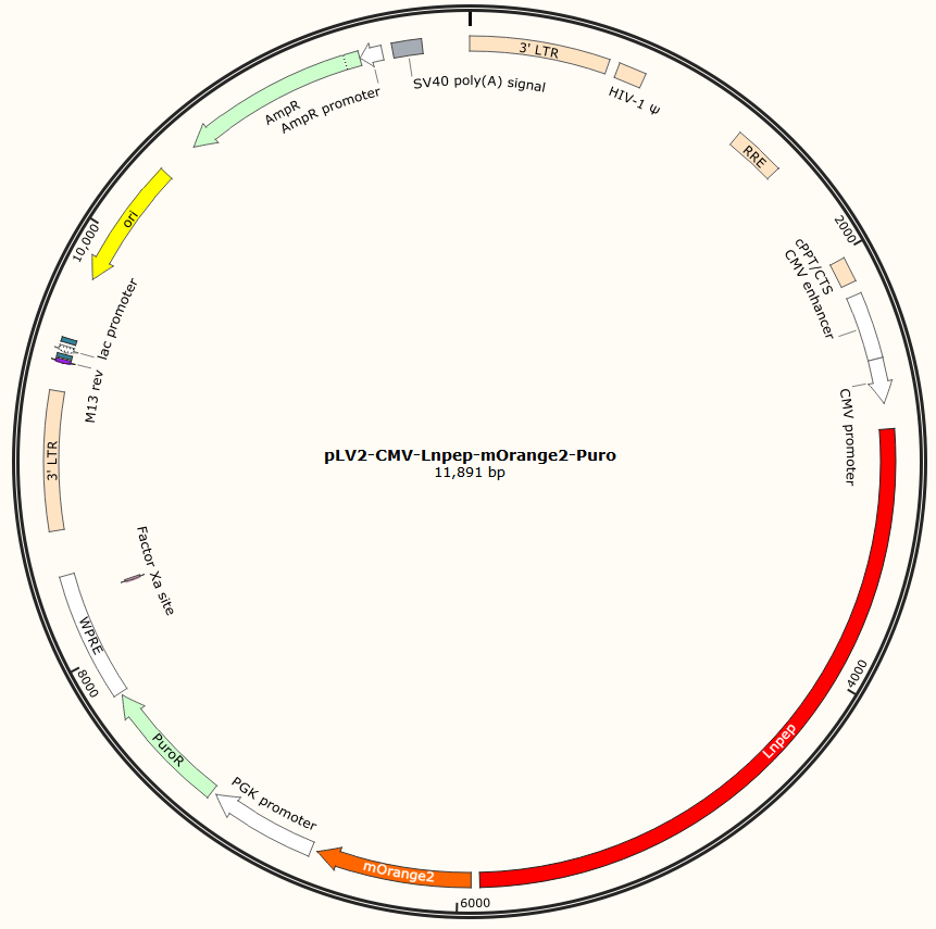 pLV2-CMV-Lnpep-mOrange2-Puro是以基恩科生物自研慢病毒骨架载体pLV2-CMV-MCS-mOrange2-Puro为骨架载体构建,过表达小鼠Lnpep基因,与载体PMD2.G和Pspax2配套进行慢病毒包装。