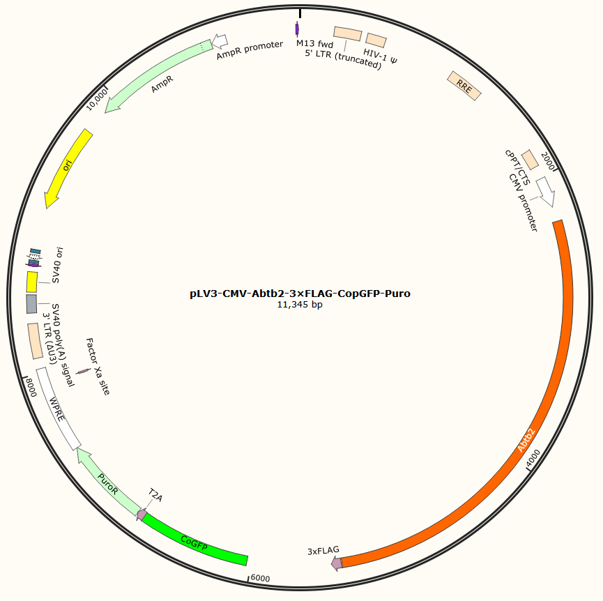 pLV3-CMV-Abtb2-3×FLAG-CopGFP-Puro是以基恩科生物自研慢病毒骨架载体pLV3-CMV-MCS-3×FLAG-CopGFP-Puro为骨架载体构建,过表达小鼠Abtb2基因,与载体PMD2.G和Pspax2配套进行慢病毒包装。