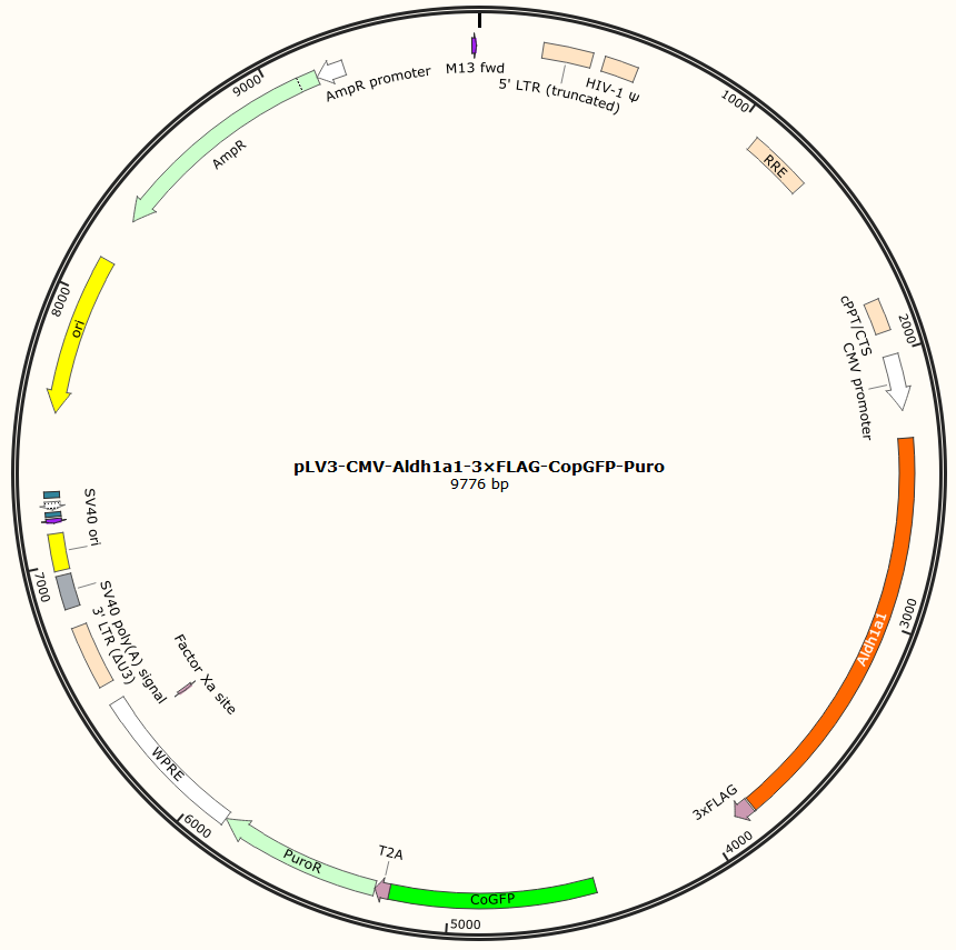 pLV3-CMV-Aldh1a1-3×FLAG-CopGFP-Puro是以基恩科生物自研慢病毒骨架载体pLV3-CMV-MCS-3×FLAG-CopGFP-Puro为骨架载体构建,过表达小鼠Aldh1a1基因,与载体PMD2.G和Pspax2配套进行慢病毒包装。