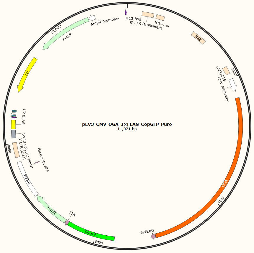 | GC020401140 | pLV3-CMV-OGA-3×FLAG-CopGFP-Puro | 2μg | OGA基因过表达 | 800.00 | 2-3天 |