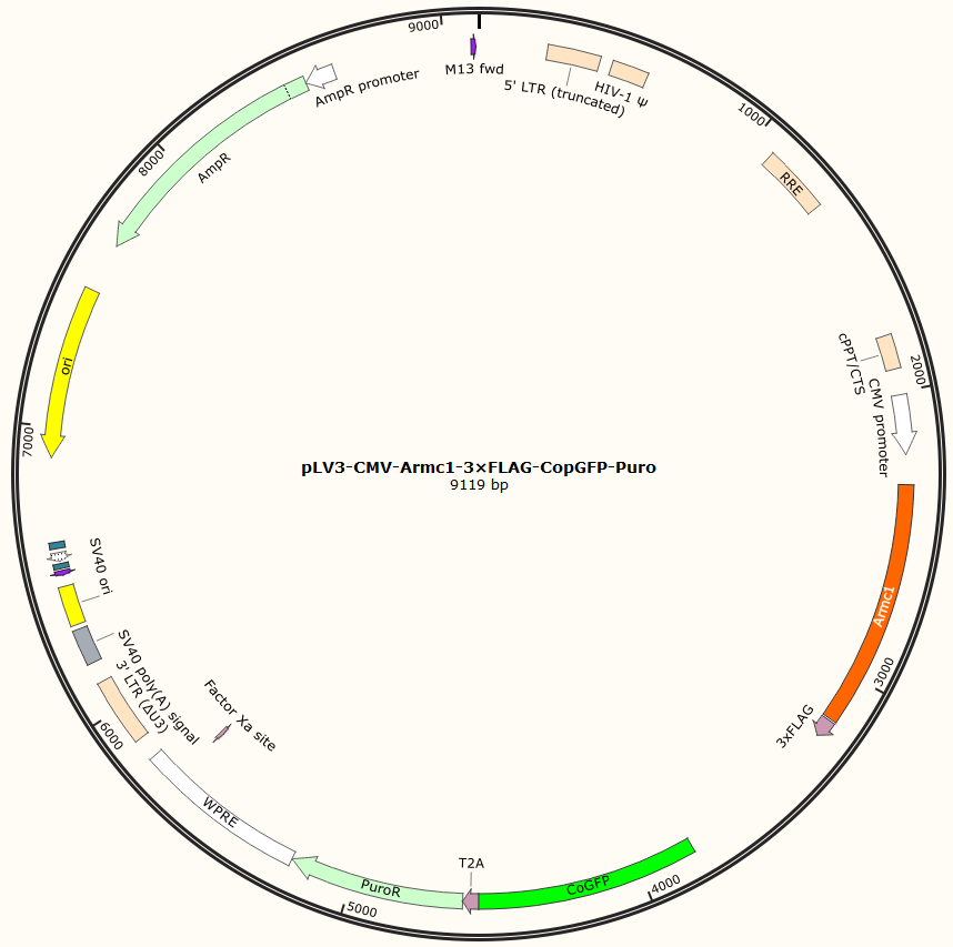 pLV3-CMV-Armc1-3×FLAG-CopGFP-Puro是以基恩科生物自研慢病毒骨架载体pLV3-CMV-MCS-3×FLAG-CopGFP-Puro为骨架载体构建,过表达小鼠Armc1基因,与载体PMD2.G和Pspax2配套进行慢病毒包装。