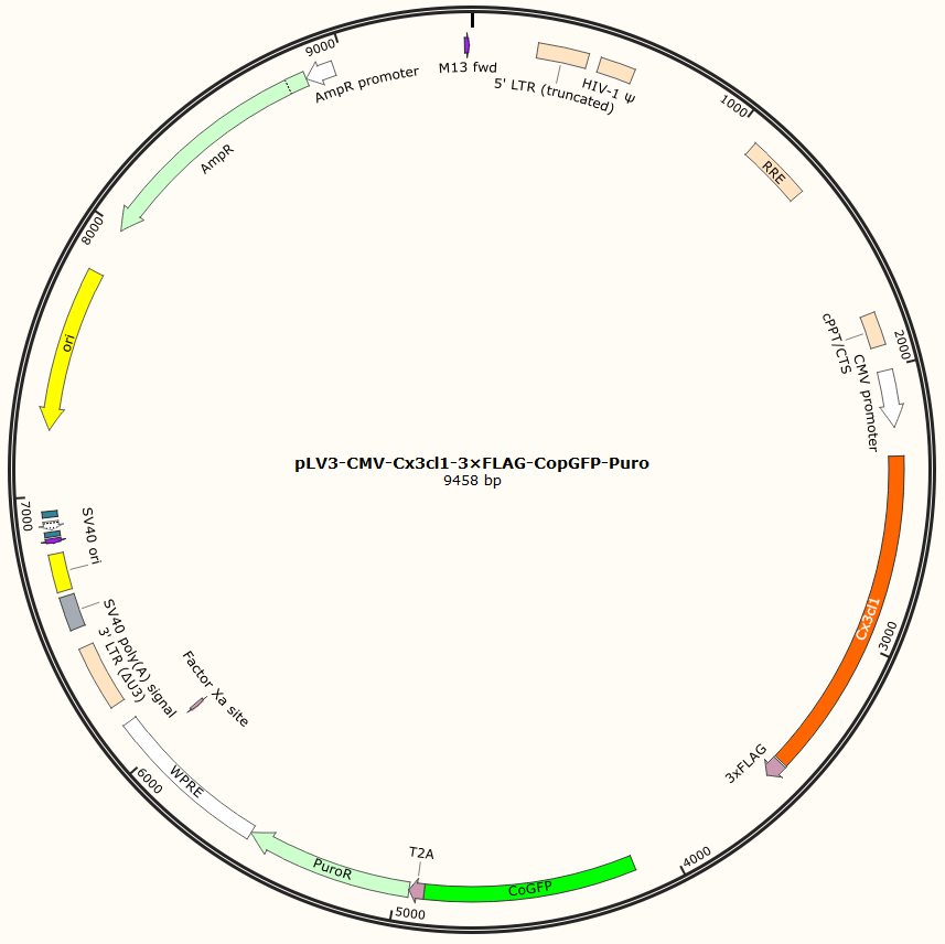 pLV3-CMV-Cx3cl1-3×FLAG-CopGFP-Puro是以基恩科生物自研慢病毒骨架载体pLV3-CMV-MCS-3×FLAG-CopGFP-Puro为骨架载体构建,过表达小鼠Cx3cl1基因,与载体PMD2.G和Pspax2配套进行慢病毒包装。