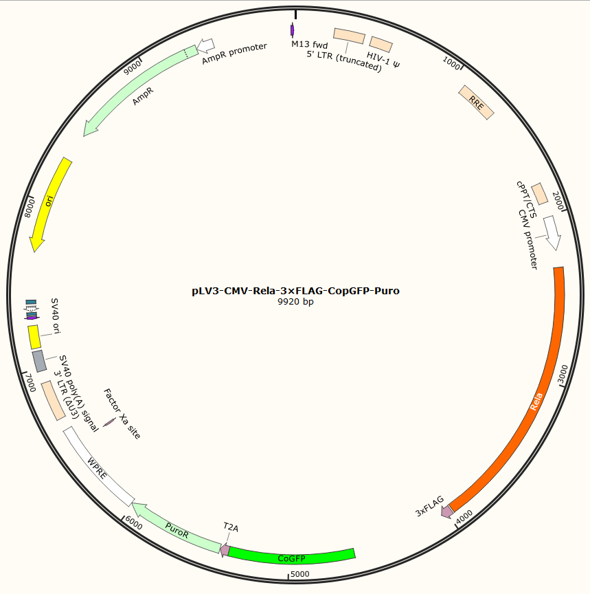 pLV3-CMV-Rela-3×FLAG-CopGFP-Puro是以基恩科生物自研慢病毒骨架载体pLV3-CMV-MCS-3×FLAG-CopGFP-Puro为骨架载体构建,过表达小鼠Rela基因,与载体PMD2.G和Pspax2配套进行慢病毒包装。