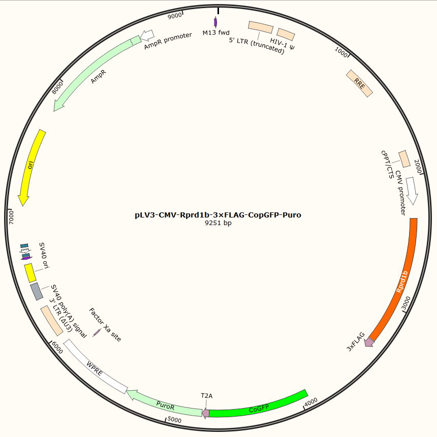 pLV3-CMV-Rprd1b-3×FLAG-CopGFP-Puro是以基恩科生物自研慢病毒骨架载体pLV3-CMV-MCS-3×FLAG-CopGFP-Puro为骨架载体构建,过表达小鼠Rprd1b基因,与载体PMD2.G和Pspax2配套进行慢病毒包装。