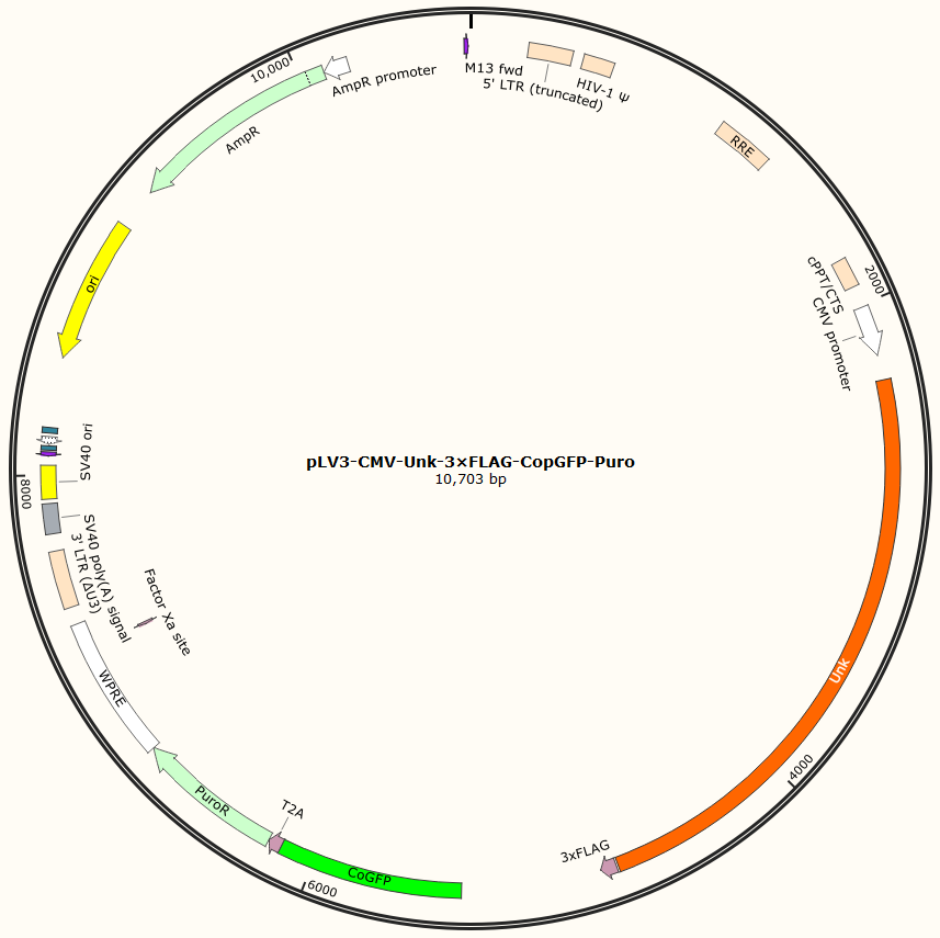 | GC020401179 | pLV3-CMV-Unk-3×FLAG-CopGFP-Puro | 2μg | Unk基因过表达 | 800.00 | 2-3天 |