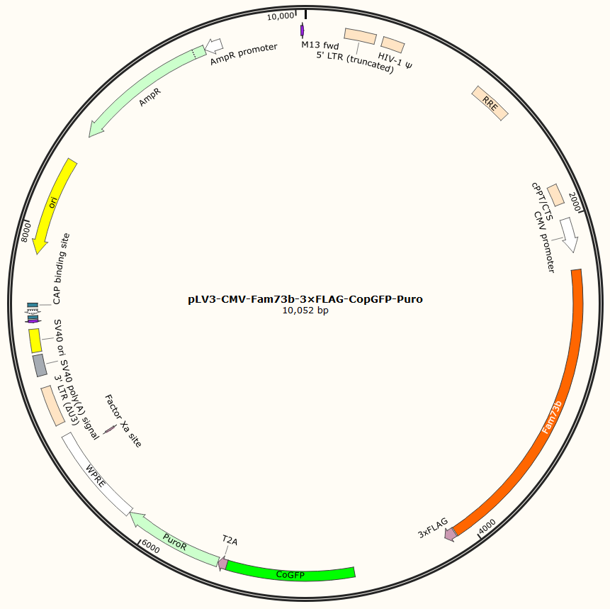 | GC020401215 | pLV3-CMV-Fam73b-3×FLAG-CopGFP-Puro | 2μg | Fam73b基因过表达 | 800.00 | 2-3天 |