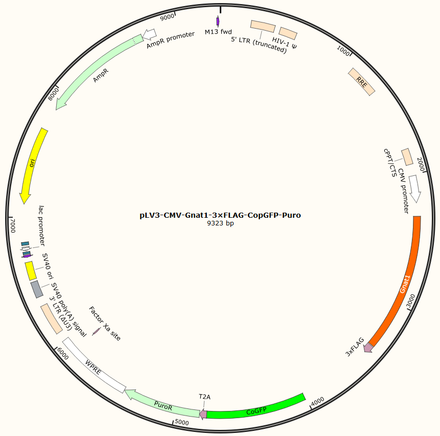 pLV3-CMV-Gnat1-3×FLAG-CopGFP-Puro是以基恩科生物自研慢病毒骨架载体pLV3-CMV-MCS-3×FLAG-CopGFP-Puro为骨架载体构建,过表达小鼠Gnat1基因,与载体PMD2.G和Pspax2配套进行慢病毒包装。