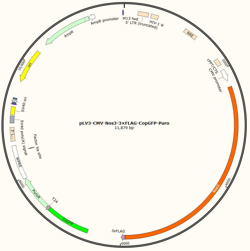 pLV3-CMV-Nos3-3×FLAG-CopGFP-Puro是以基恩科生物自研慢病毒骨架载体pLV3-CMV-MCS-3×FLAG-CopGFP-Puro为骨架载体构建,过表达小鼠Nos3基因,与载体PMD2.G和Pspax2配套进行慢病毒包装。