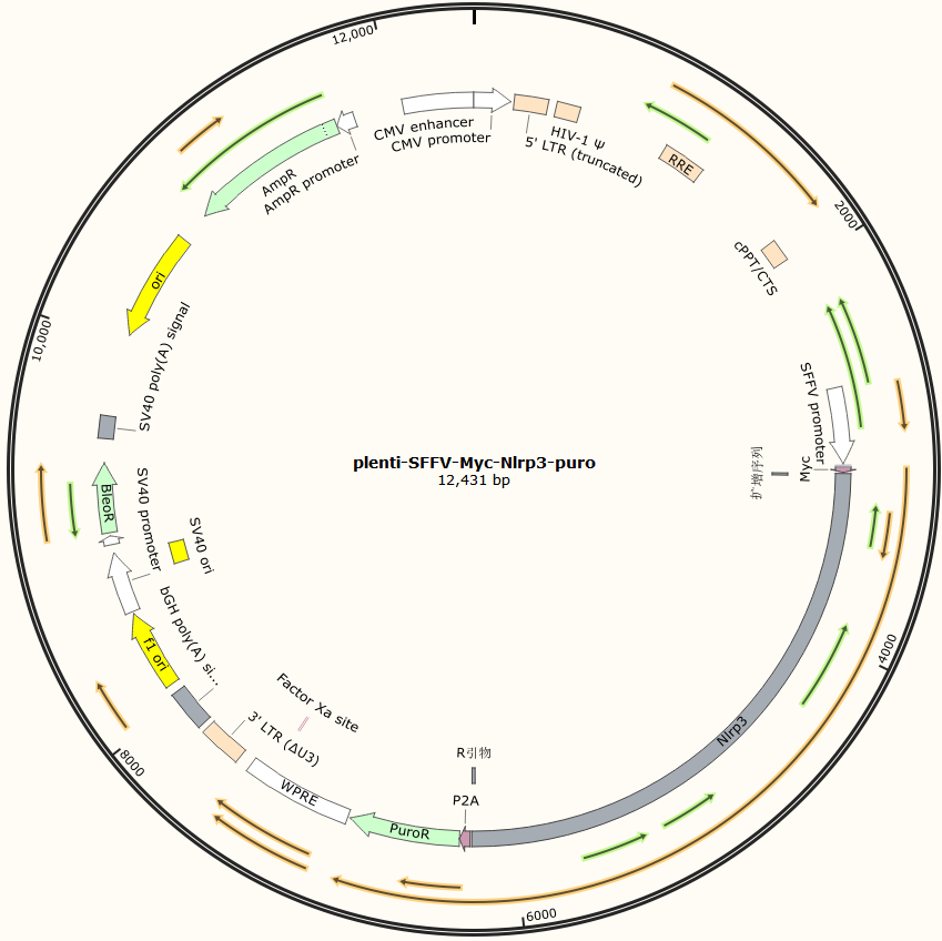 plenti-SFFV-Myc-Nlrp3-puro是以基恩科生物自研慢病毒骨架载体plenti-SFFV-MCS-puro为骨架载体构建,过表达小鼠Nlrp3基因,与载体PMD2.G和Pspax2配套进行慢病毒包装。