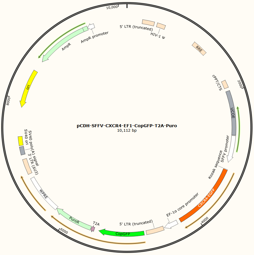 pCDH-SFFV-CXCR4-EF1-CopGFP-T2A-Puro是以基恩科生物自研慢病毒骨架载体pCDH-SFFV-MCS-CopGFP-Puro为骨架载体构建,过表达大鼠CXCR4基因,与载体PMD2.G和Pspax2配套进行慢病毒包装。