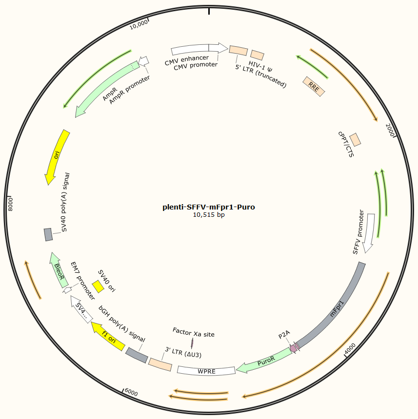 Lenti-SFFV-mFPR1-Puro以基恩科生物自研慢病毒骨架载体Lenti-SFFV-MCS-Puro为骨架载体构建,过表达小鼠FPR1基因,与载体PMD2.G和Pspax2配套进行慢病毒包装。