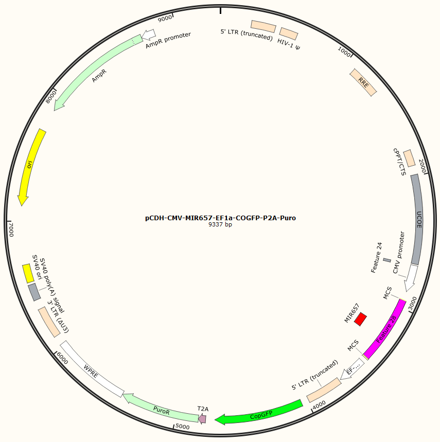 pCDH-CMV-MIR657-EF1a-COGFP-Puro是以基恩科生物自研慢病毒骨架载体pCDH-CMV-MCS-COGFP-Puro为骨架载体构建,过表达人MIR657基因,与载体PMD2.G和Pspax2配套进行慢病毒包装。