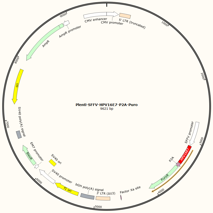 Plenti-SFFV-HPV16E7-P2A-Puro 是以基恩科生物自研慢病毒骨架载体PLenti-SFFV-MCS-Puro为骨架载体构建,过表达人HPV16E7基因,与载体PMD2.G和Pspax2配套进行慢病毒包装。