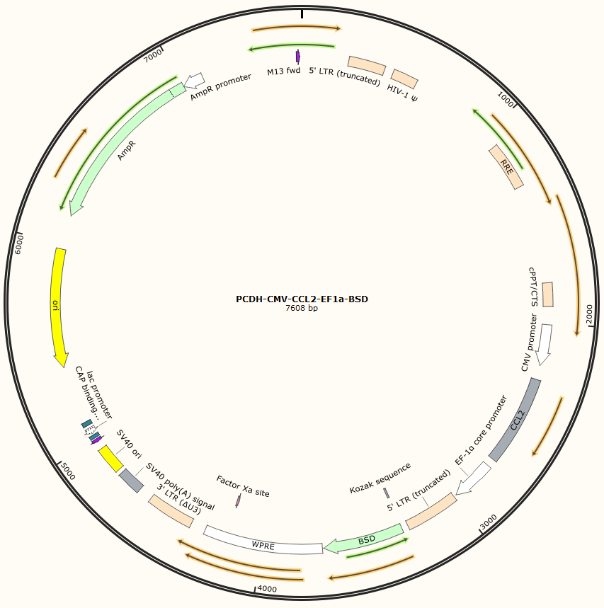 PCDH-CMV-CCL2-EF1a-BSD是以基恩科生物自研慢病毒骨架载体PCDH-CMV-MCS-EF1a-BSD为骨架载体构建,过表达人CCL2基因,与载体PMD2.G和Pspax2配套进行慢病毒包装。