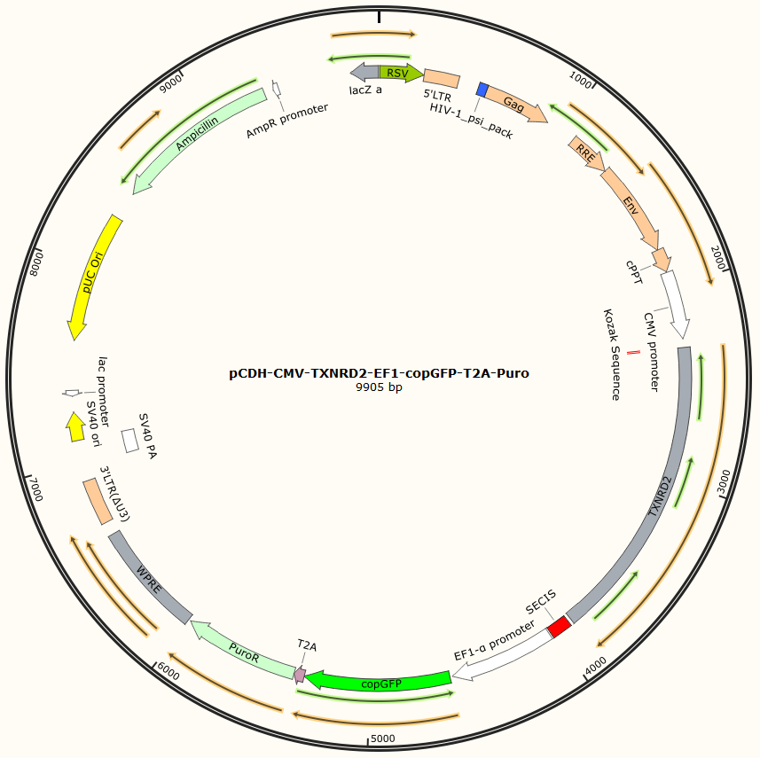 pCDH-CMV-TXNRD2-EF1a-copGFP-T2A-Puro是以基恩科生物自研慢病毒骨架载体pCDH-CMV-MCS-EF1a-copGFP-T2A-Puro为骨架载体构建,过表达人MDM2基因,与载体PMD2.G和Pspax2配套进行慢病毒包装。