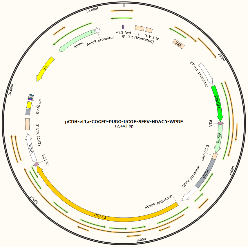 pCDH-EF1a-CoGFP-Puro-SFFV-HDAC5-Flag-WPRE是以基恩科生物自研慢病毒骨架载体pCDH-EF1a-CoGFP-Puro-SFFV-MCS-Flag-WPRE为骨架载体构建,过表达人HDAC5基因,与载体PMD2.G和Pspax2配套进行慢病毒包装。