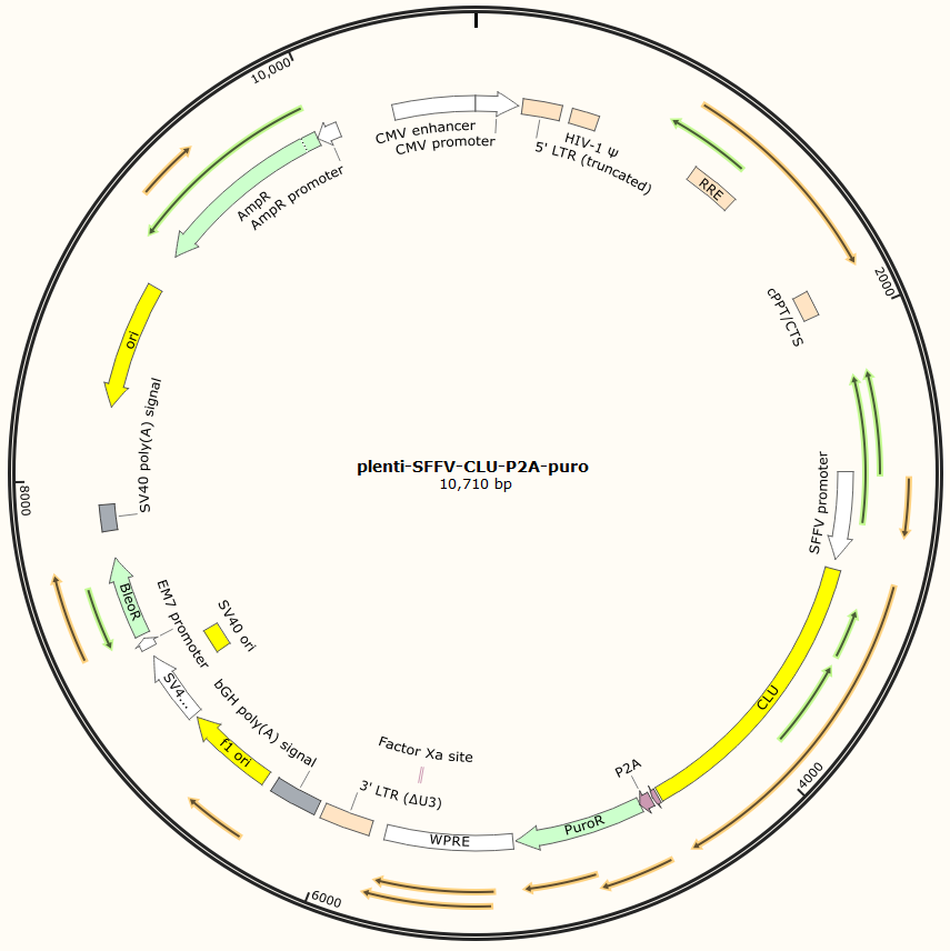 Plenti-SFFV-CLU-P2A-Puro是以基恩科生物自研慢病毒骨架载体PLenti-SFFV-MCS-P2A-Puro为骨架载体构建,过表达人CLU基因,与载体PMD2.G和Pspax2配套进行慢病毒包装。