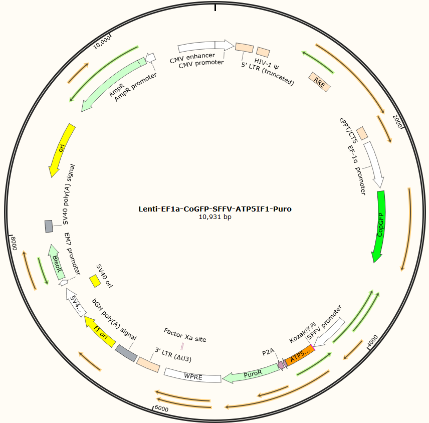 Lenti-EF1a-CoGFP-SFFV-ATP5IF1-Puro是以基恩科生物自研慢病毒骨架载体Lenti-EF1a-CoGFP-SFFV-MCS-Puro为骨架载体构建,过表达人MDM2基因,与载体PMD2.G和Pspax2配套进行慢病毒包装。
