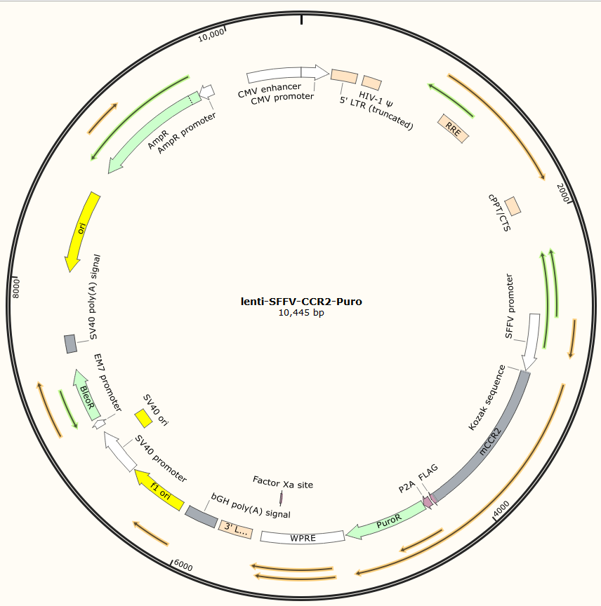 lenti-SFFV-CCR2-Puro是以基恩科生物自研慢病毒骨架载体Lenti-SFFV-MCS-Puro为骨架载体构建,过表达小鼠CCR2基因,与载体PMD2.G和Pspax2配套进行慢病毒包装。