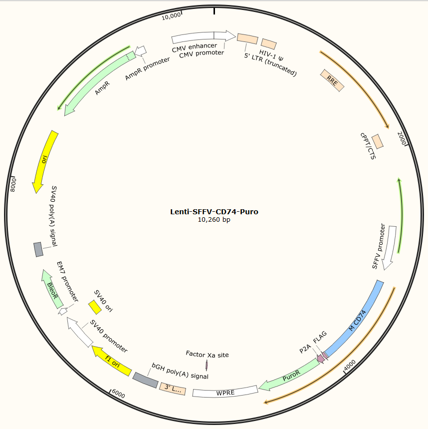 Lenti-SFFV-CD74-Puro是以基恩科生物自研慢病毒骨架载体Lenti-SFFV-MCS-Puro为骨架载体构建,过表达小鼠CD74基因,与载体PMD2.G和Pspax2配套进行慢病毒包装。