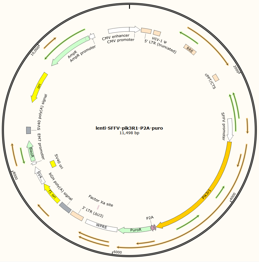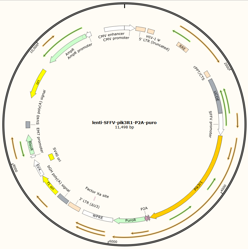 lenti-SFFV-pik3R1-P2A-puro是以基恩科生物自研慢病毒骨架载体lenti-SFFV-MCS-P2A-puro为骨架载体构建,过表达小鼠pik3R1基因,与载体PMD2.G和Pspax2配套进行慢病毒包装。