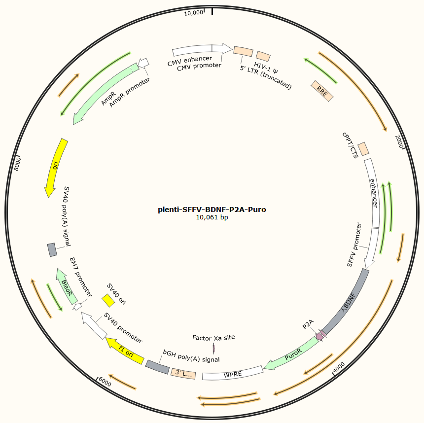 plenti-SFFV-BDNF-P2A-Puro是以基恩科生物自研慢病毒骨架载体pLenti-SFFV-MCS-Puro为骨架载体构建,过表达人BDNF基因,与载体PMD2.G和Pspax2配套进行慢病毒包装。