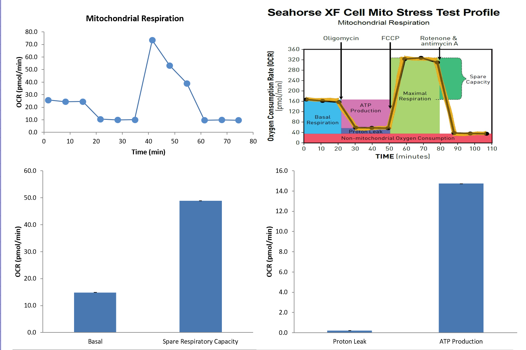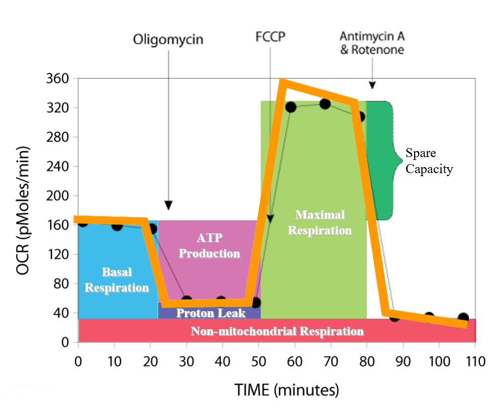 非线粒体耗氧量(Non-mitochondrial Respirarion):加入 rotenone 和 antimycinA 后仍持续的耗氧,这是由一部分细胞酶继续耗氧产生的,该参数对于精确测量线粒体呼吸功能非常重要。