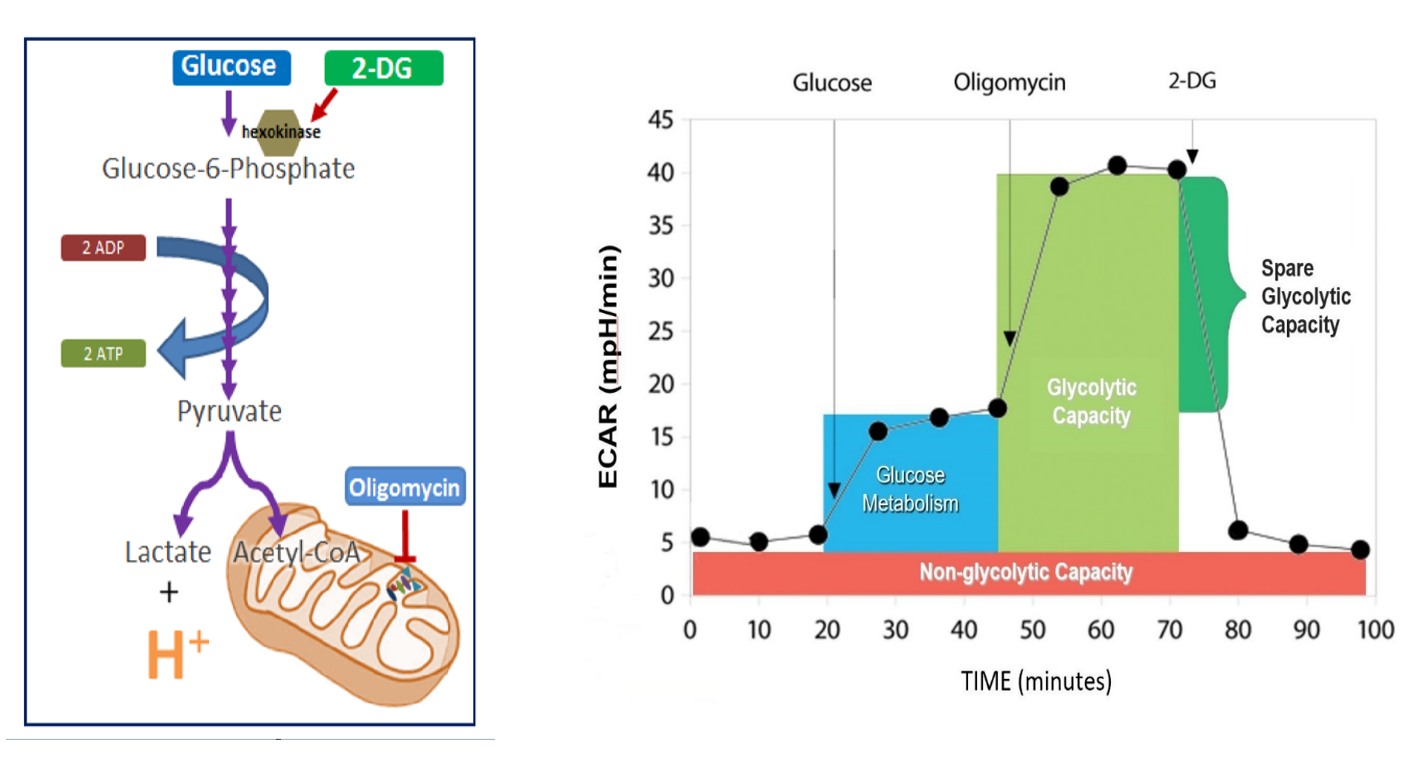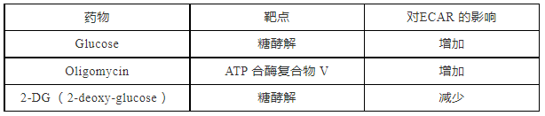 2-DG( 2-deoxy-glucose ): 2-DG 是最后加入的药物,该药通过竞争性结合糖酵解途径的己糖激酶而抑制糖酵解,引起 ECAR 降低从而证实实验中 ECAR 的产生来源于糖酵解途径。