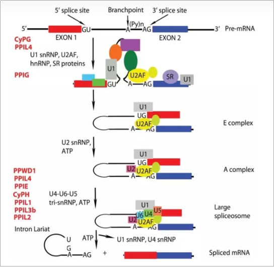 3.U1,U2,U4,U5,U6,pre mRNA形成了一个完整的剪切复合体。