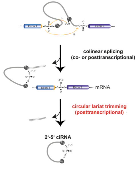 共线剪切发生两步酯交换反应,内含子branch point的腺苷与内含子的5'相连,形成2'→5'的一个套索环状RNA。此类套索环状RNA的通常在产生后的几分钟之内就会被降解掉,但它们可以变得稳定并表现出细胞功能。这是因为它们在因为在5 '剪接位点附近存在一个7个核苷酸(nts)长的基序,在branch point附近存在另一个11个nts的基序,可以抵抗2'→5'脱支和随后的降解。