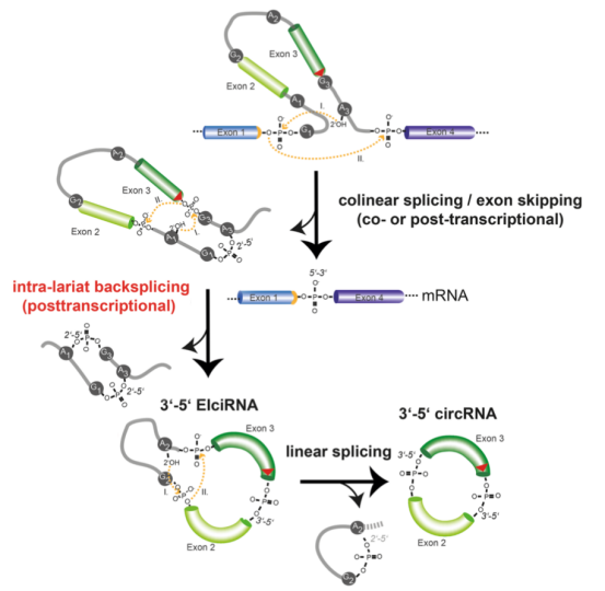 如果反向剪接中间相隔距离更长,则会涉及更多的外显子,并且中间的内含子将被吸收到成熟的环状rna中,产生所谓含外显子-内含子环状RNA (EIciRNAs)。这样的EIciRNA中的内含子随后可以通过传统的剪接切除,这会产生仅有外显子且数量>1个的环状RNA产生。