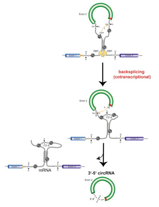 这通过3'→5'磷酸二酯键将相关序列连接起来,并产生环状RNA。反剪接可以通过两种主要机制进行,上图展示的为新生mRNA共转录过程中的反剪接过程。