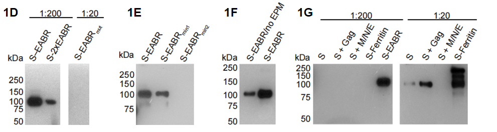 研究人员测试了无EPM的S-EABR构造体的eVLP产生。Western blot分析显示表明,与无EPM的S-EABR相比,S-EABR转染的细胞中检测到eVLP纯化后S蛋白的量明显多,而去除掉 EPM 序列,eVLP 产生量显著减少。表明EPM增强了eVLP的产生(图1F)。